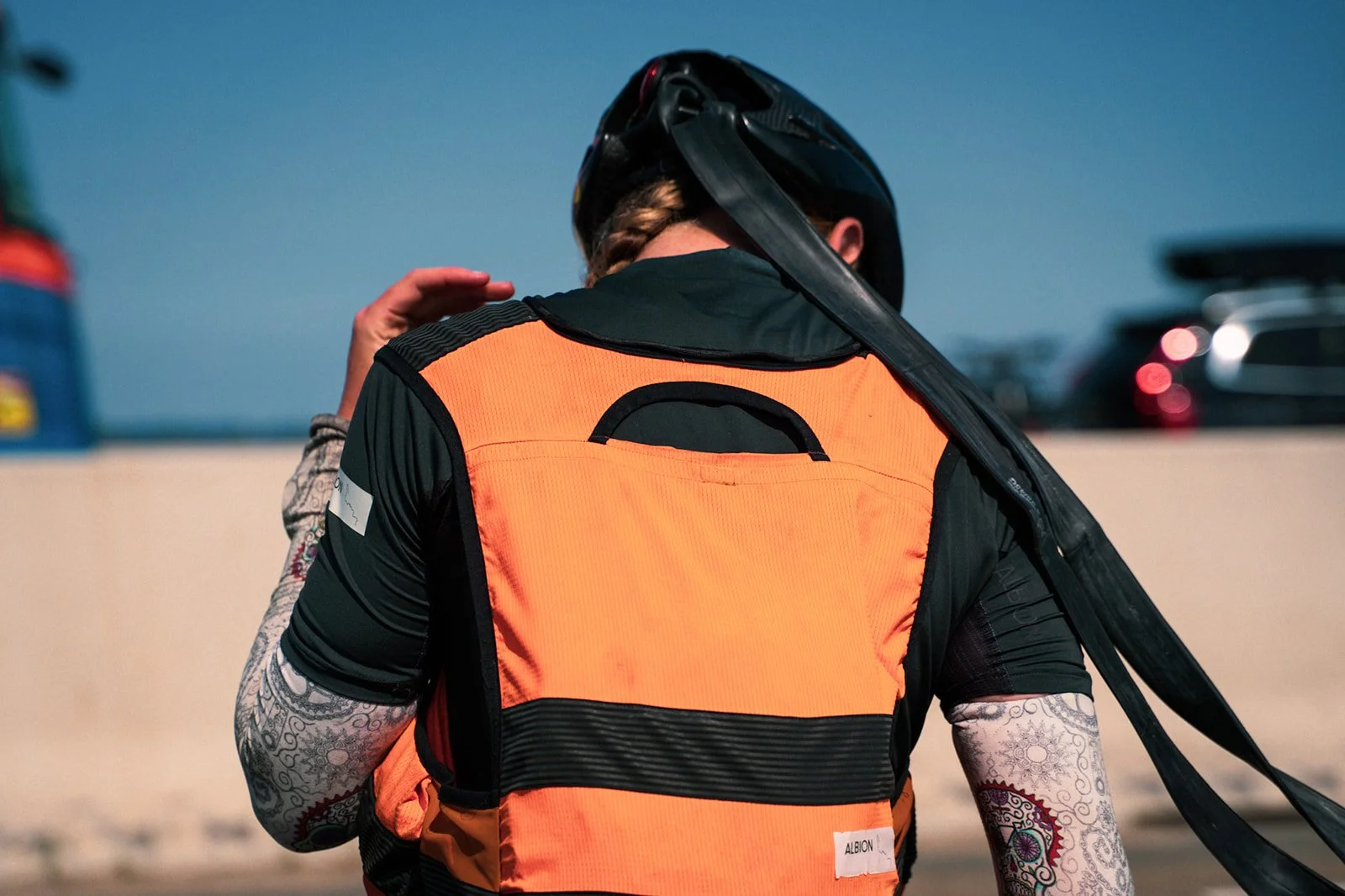 Scratching over the last 350km consumed my thoughts. Riding mainly sitting upright on my aerobar pads, I was struggling even with that, and any turn or uneven surface required one hand on the hoods - riding in an agonizing position. I was slowing immensely, having to stop constantly to rest, unable to control the bike properly. Hitting a town about 250km from the finish, finishing felt impossible in my current state, I found another McDonald's to rest and work out my plan. Here someone suggested what would allow me to limp to the end - using an inner tube to hold my head up enough to see. I was initially worried about coping with this solution: an inner tube attached to my helmet at one end and my tailfin bag at the other, supporting my head when my neck couldn't. After a couple of false starts, I got used to the new setup. Nervous about riding attached to my bike by my head, I rode cautiously, walking the couple of routing errors over gravel, taking things slowly. I still needed to stretch and rest constantly, breaking my ride into small chunks with rests to lie down and stretch.